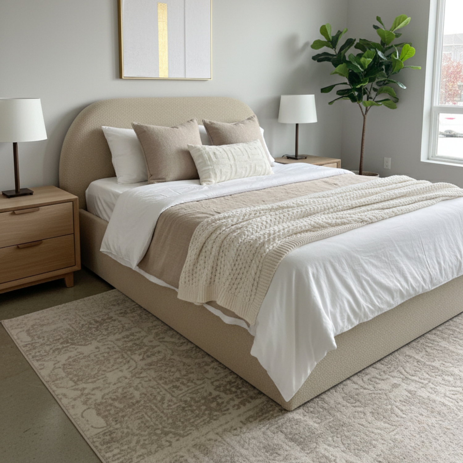 Wrapped in a cozy beige fabric with a soft, textured feel, its curved headboard and clean-lined frame create a modern yet inviting look.