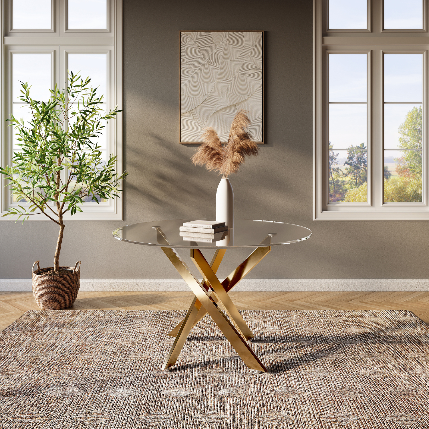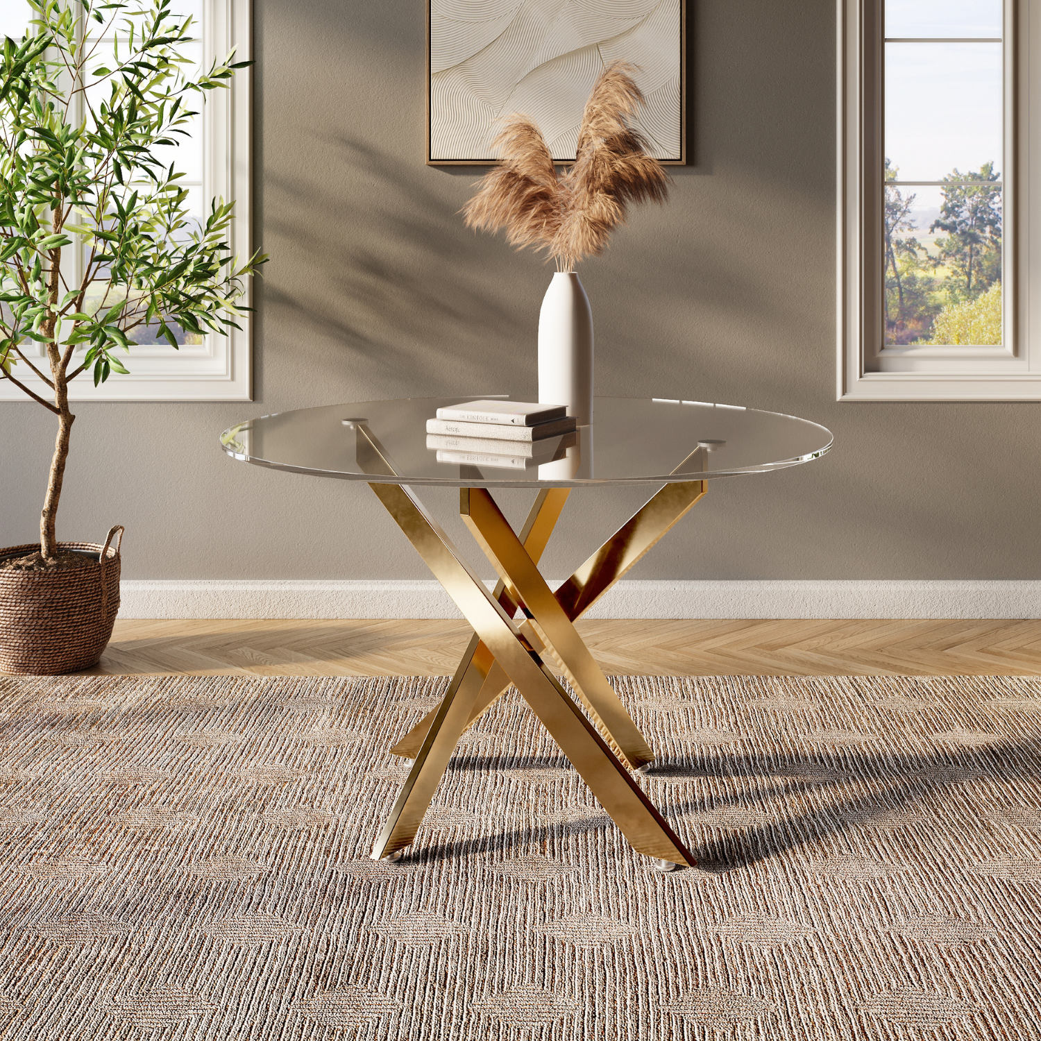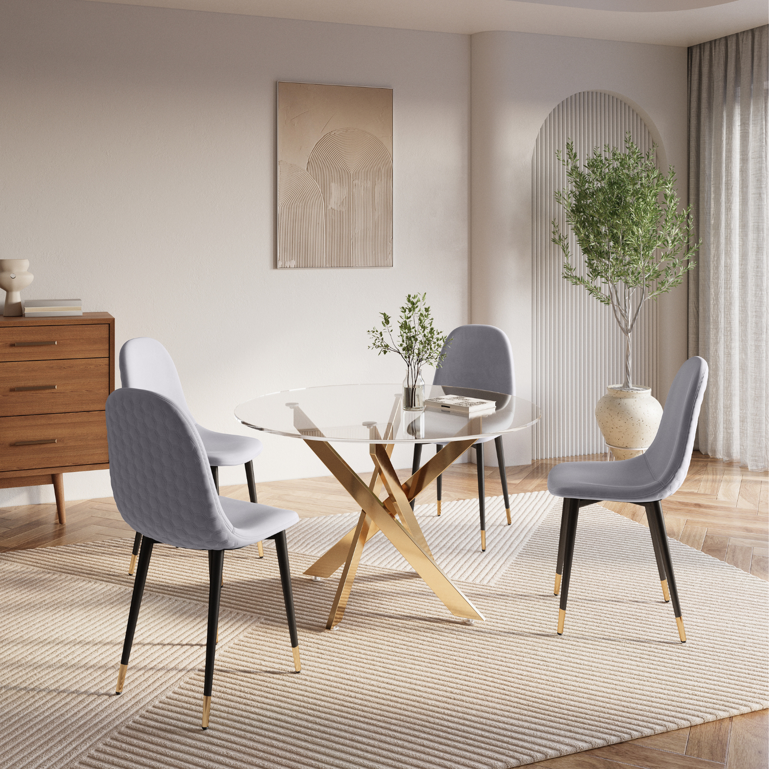 The Sabine Dining Table redefines modern sophistication. A clear glass top paired with Gold legs creates a strikingly contemporary design that blends elegance and functionality.