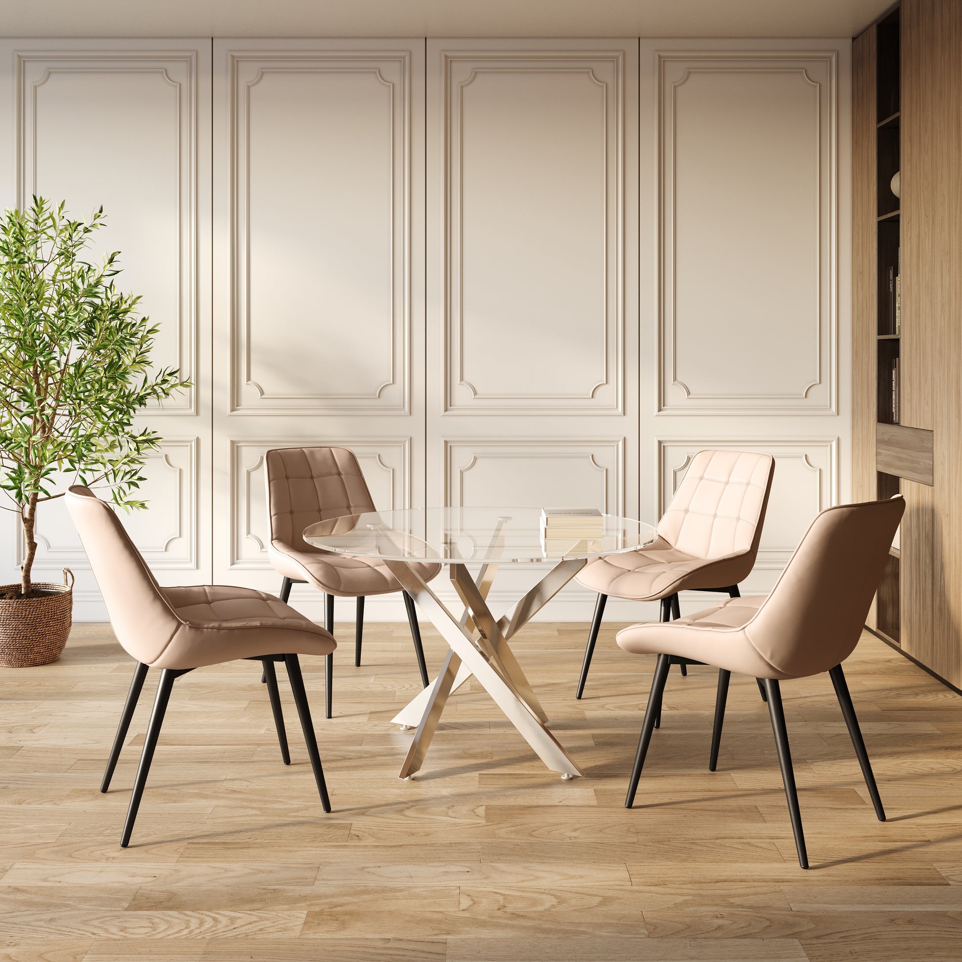 The Sabine Rusty Dining Set brings together clean lines and natural warmth. The Sabine Dining Table features a clear glass top supported by sleek chrome legs, offering a fresh, open feel. Paired with the Rusty Dining Chairs, wrapped in taupe velvet with black legs, this set adds a refined touch to any dining space, making it the perfect choice for those who value simplicity and style.